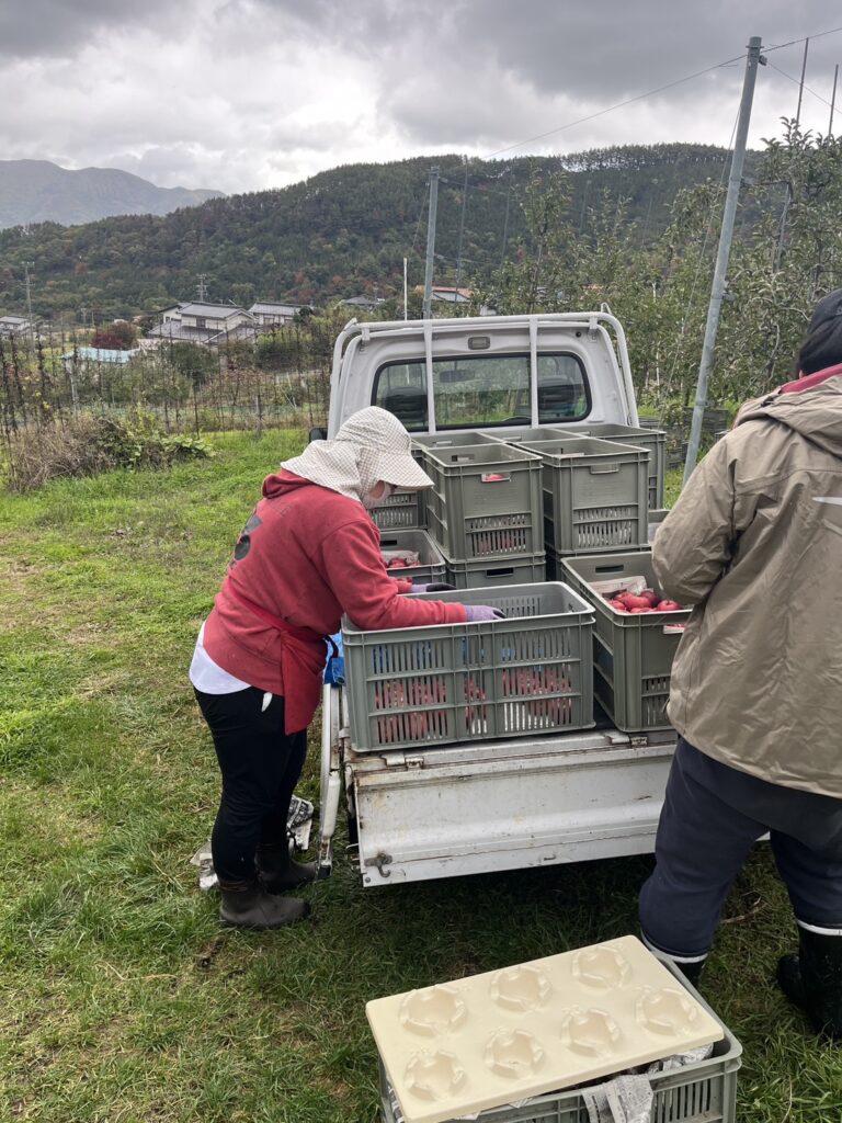 午前中は「シナノホッペ」の収穫を行いました。作業の途中で雨が降り出したため、収穫作業はいったん中断し、屋内での仕分け作業に切り替えました。