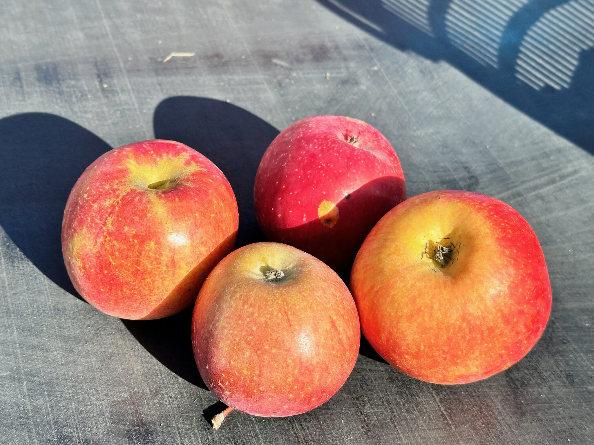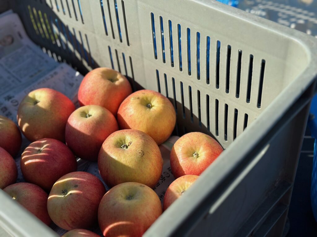 サンフジの収穫は、りんごの色で判断しています。お尻の部分が透き通った黄色がベストだと教わりましたが、これを見極めるのが本当に大変(^^;;「これいいんじゃない?」と思って聞いてみると「それはまだなのよ〜♪」という会話が何度繰り返されたでしょうか。笑ですが、毎日見て、手に取って、試食していると不思議と感覚が磨がれて、「これだ!!」とわかるようになります。