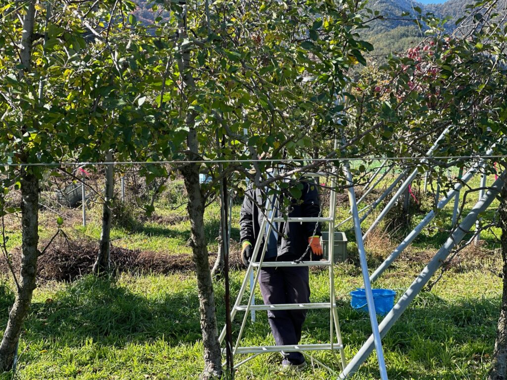今日は”Work Together”プログラムに参加しているJくんが来ました。以前まで高い梯子は「怖い」と言ってチャレンジしてませんでしたが、今日、「やってみる?」と聞くと、「はい、やってみます」とのこと。梯子の掛け方、どこまで乗るか、収穫用のかごをどうするかなど、一つずつ教えると、しっかりと理解し、りんごをたくさん収穫してくれました。「意外といける」ということが分かったようで、「次はどこをやりますか?」と率先して仕事に向き合う姿が見られました。