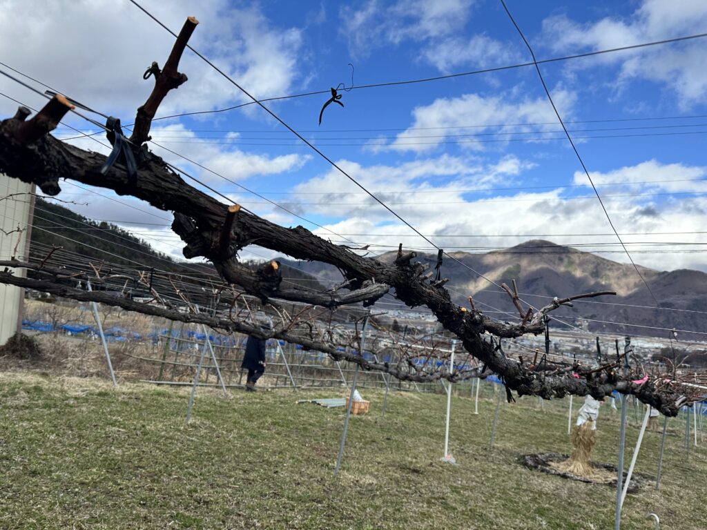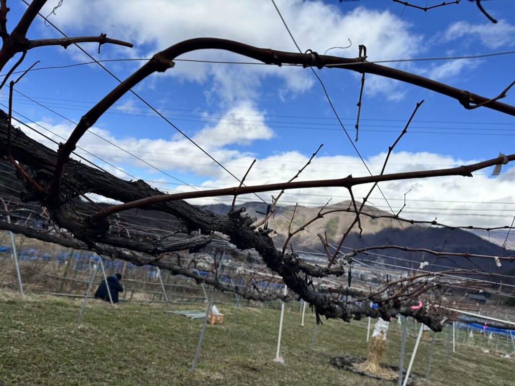 これから暖かくなっていくと、乾燥していたぶどうが潤い始め、樹液の流れも活発になるとのことで、その前に終わらせる必要があります。幸い、まだ寒い気候ではあるので、枝に水があがることなく、ほとんどの剪定を終えることができました。